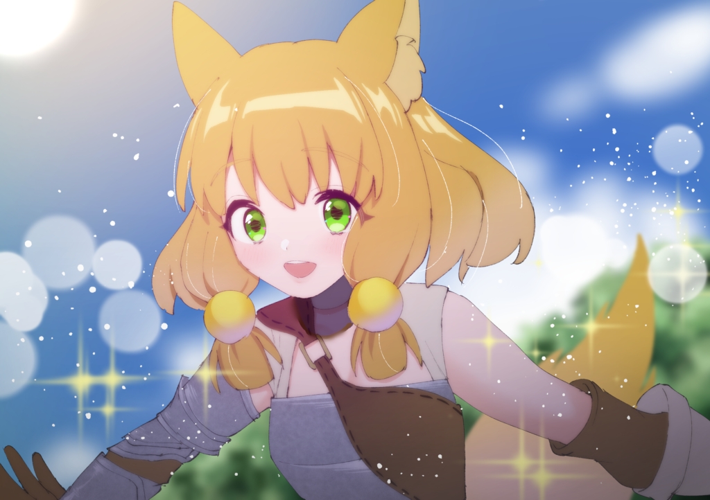最初に描いてもらったラディコのファンアート。元気いっぱいの輝く笑顔と、ふわっと広がるボブヘアー。ピンと立った獣耳&尻尾がたいへんかわいい。
