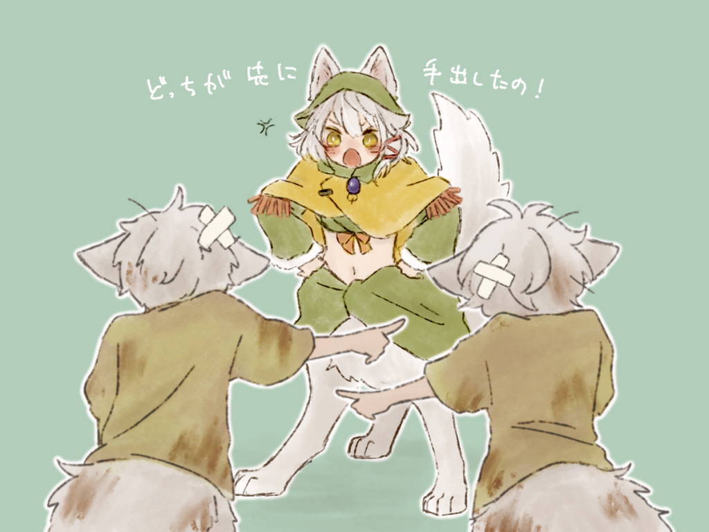 お互いにお互いを指差すやんちゃな弟たちと、お姉ちゃんからげんこつを御見舞されたと思しき大きなばってんマークが凄く可愛い。そして腰に手を当てて叱るルカの愛らしさよ……! ピンと立った尻尾も素晴らしいです。