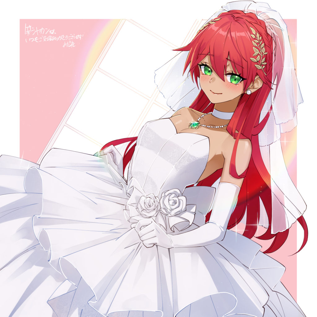 よだれさんのファンボックスの「高級よだれかけ」プランの特典として描いて貰ったユニスのウェディングドレス姿。めちゃくちゃ美人……! 普段かわいい・元気系の子がこういうしっとりした美しさを見せてくれるとグッときますね。褐色肌に白いドレスがまぶしい……!