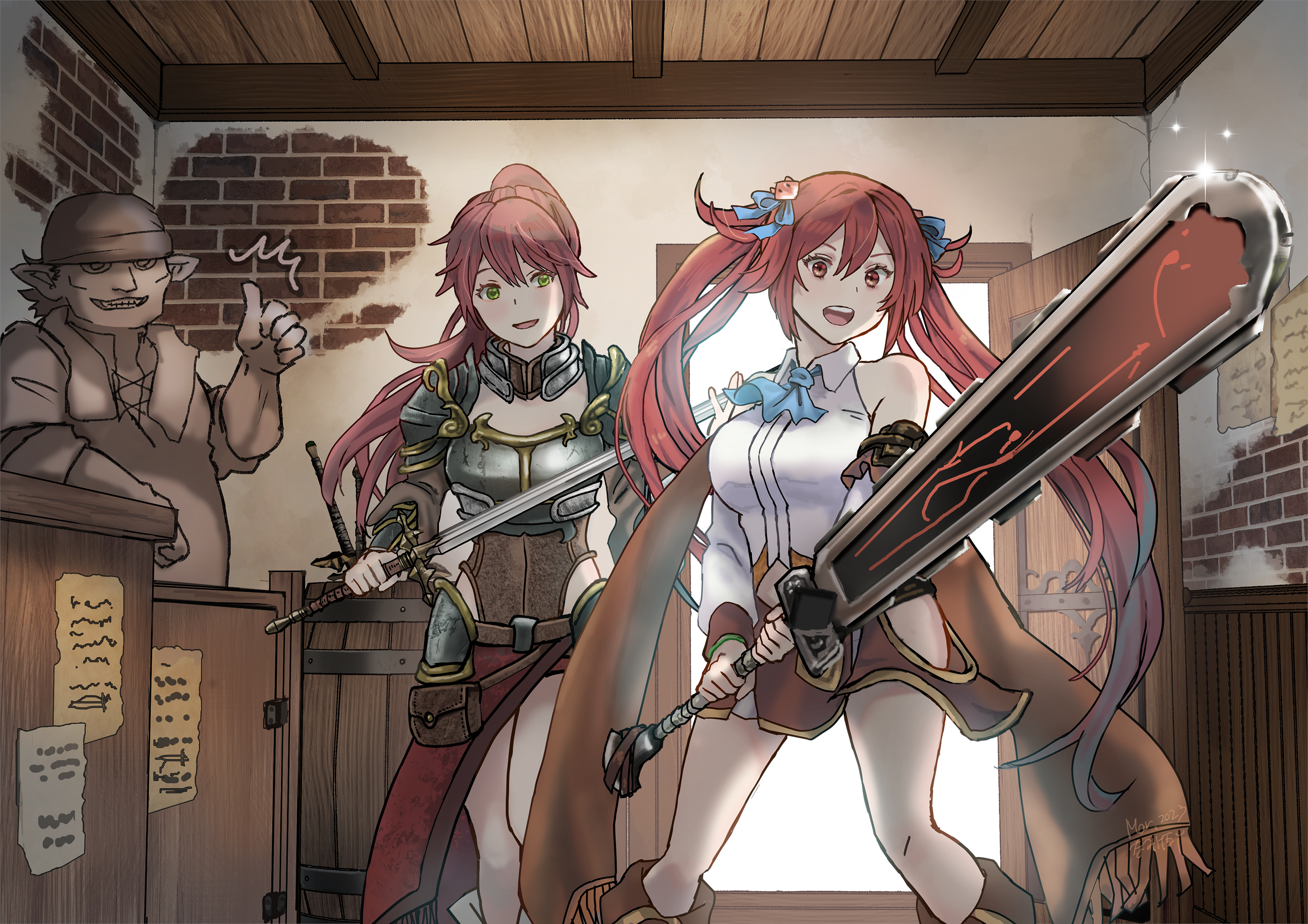 赤毛・低身長・元気っ子剣士という性癖二人のイラストをSkebでお願いした一枚。