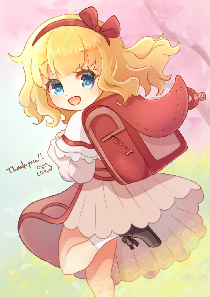 桜の咲く季節、暖かな陽気に包まれて元気に投稿するマリーちゃんの愛らしさ。そしてランドセルの留具が外れているうっかりっぷりも可愛いです。