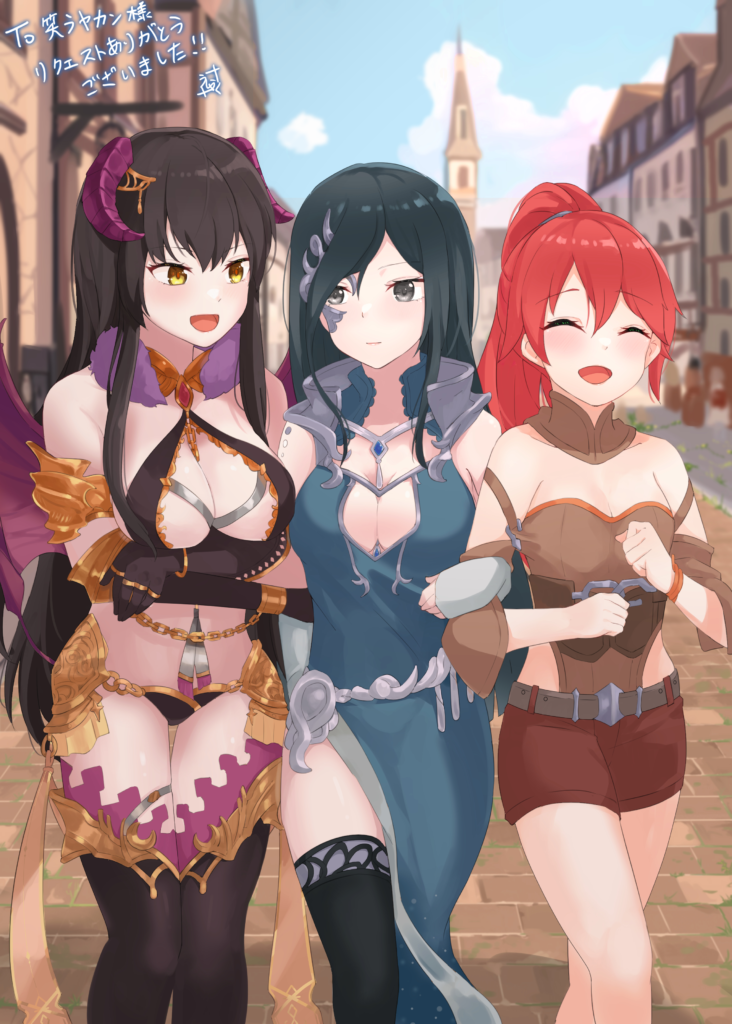腕をくみあいデートする三人娘。とても楽しそうな雰囲気が伝わってきて最の高。かわいい。この尊い雰囲気に挟まって殺されないオウルさんは凄い。