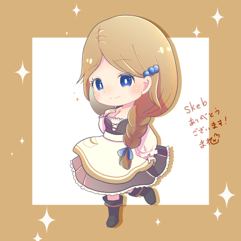 日和稀さんに描いて貰っているディフォルメまおはじヒロインズ第五段。後頭部の曲線と、ふわっと広がるエプロンドレスが良すぎる……