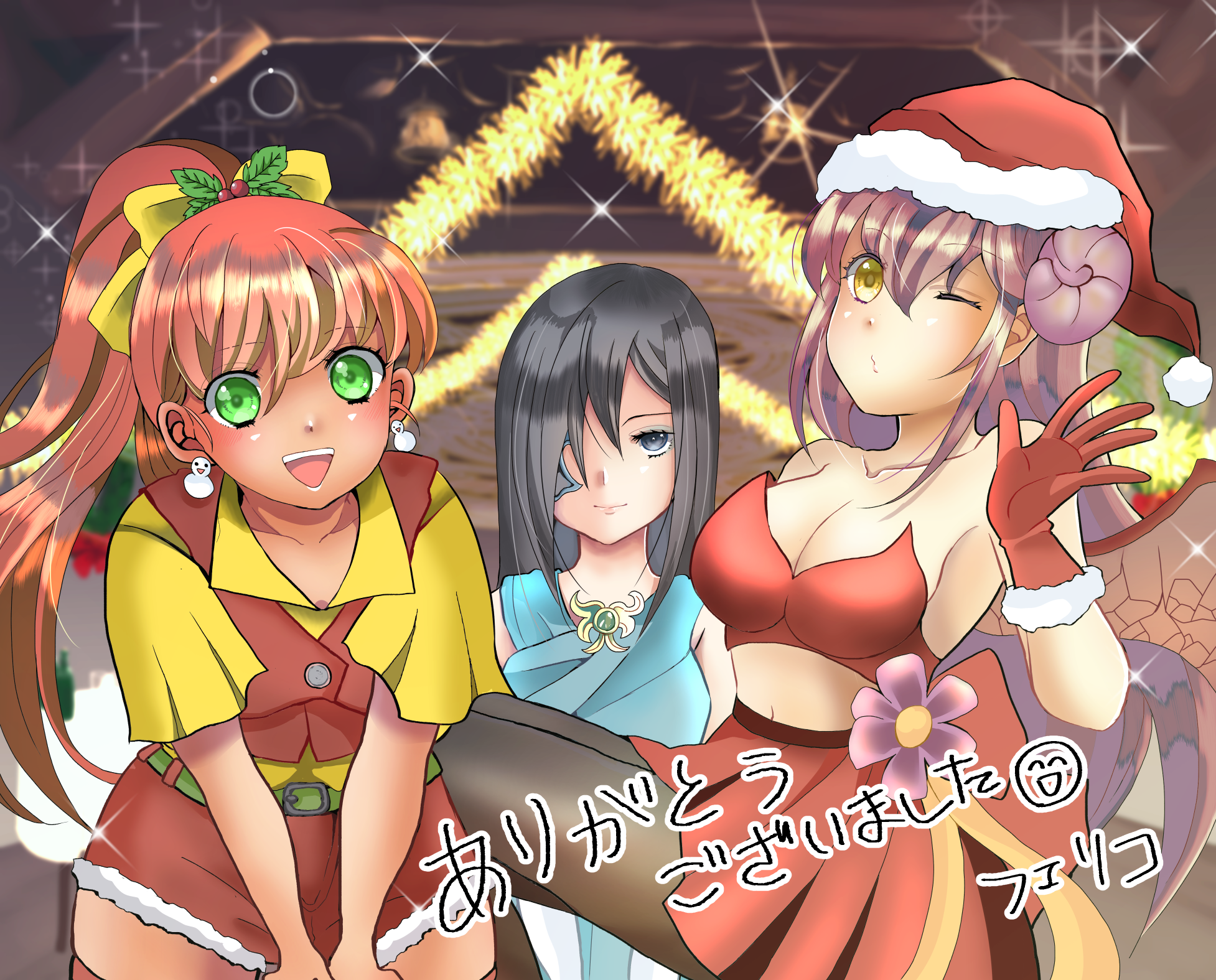 それぞれの考えるクリスマス衣装に身を包んだメインヒロイン三人娘。全力でサンタコスのリル、クリスマスカラーモチーフを身に着けたユニス、フォーマルドレスのスピナと三者三様。あえてクリスマスらしさを全く無視したスピナがものすごくそれらしくて好きです。