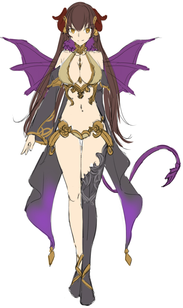 趣味は魔力で服を編むことで、ダンジョン一の衣装持ち。普段着は下着にしか見えないが男を誘惑するためのサキュバスの伝統的な装束であり、このタイプだけでも何種類もバリエーションを持っている。