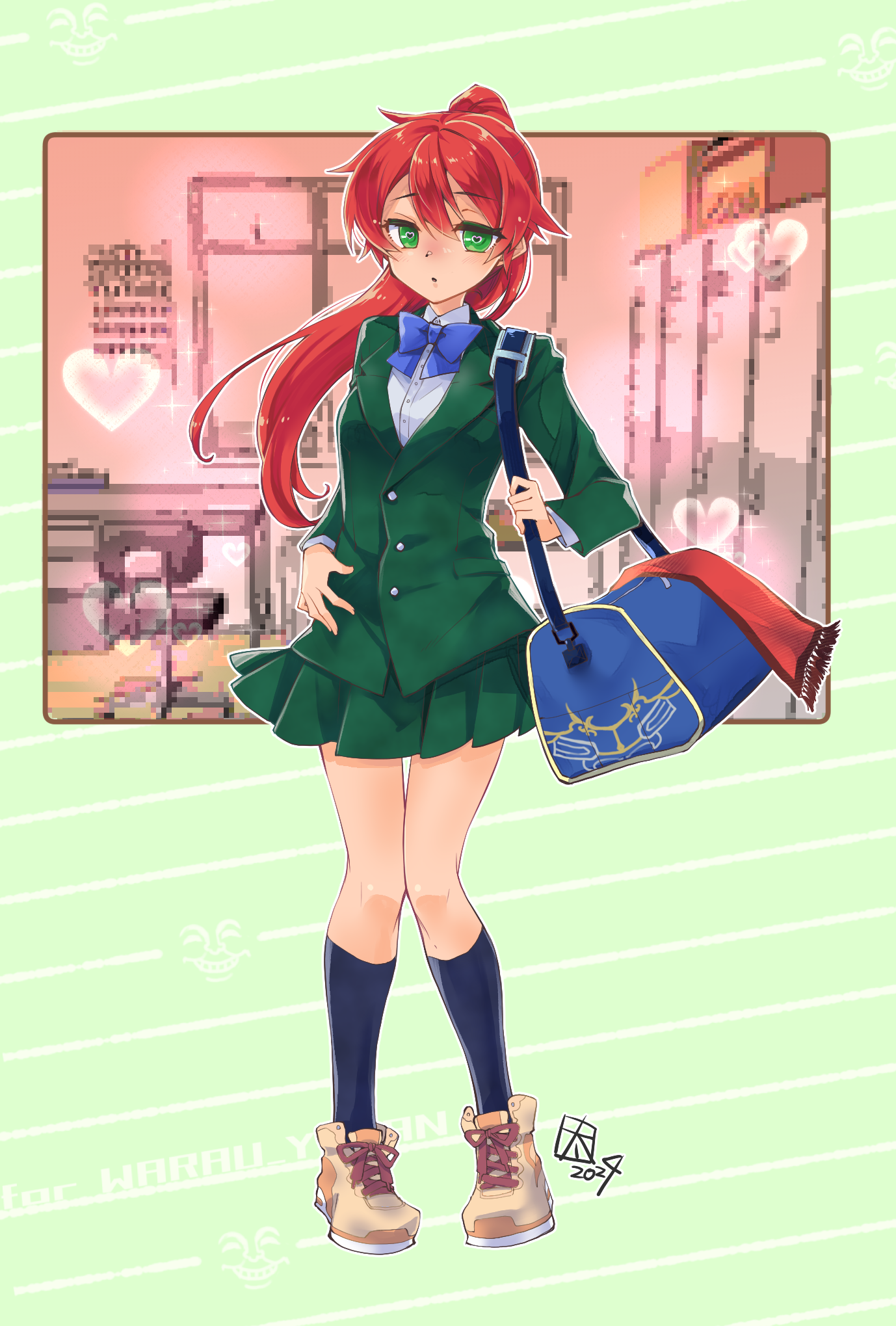 水泳部ユニスを描いて頂きました。まおはじキャラは全員同じ制服ですが、それぞれ着こなしに差があって嬉しいですね! セリフで見づらくなってますが元デザインを流用したカバンやタオルも素敵!