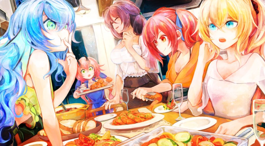 欲しいFAリストNo.58「ご飯を掠め取るリンに文句をいうニーナの横でユウキがちゃっかりと自分の分を確保しクリュセが追加の料理を運んでくる所をアイが微笑ましげに見ているところ」を描いて頂いたもの。料理の描写に一目ぼれして描いてもらったのですが、もうほんと素晴らしい。原作もしっかり読み込んでキャラクターを描写して頂いて、感謝しきりです。