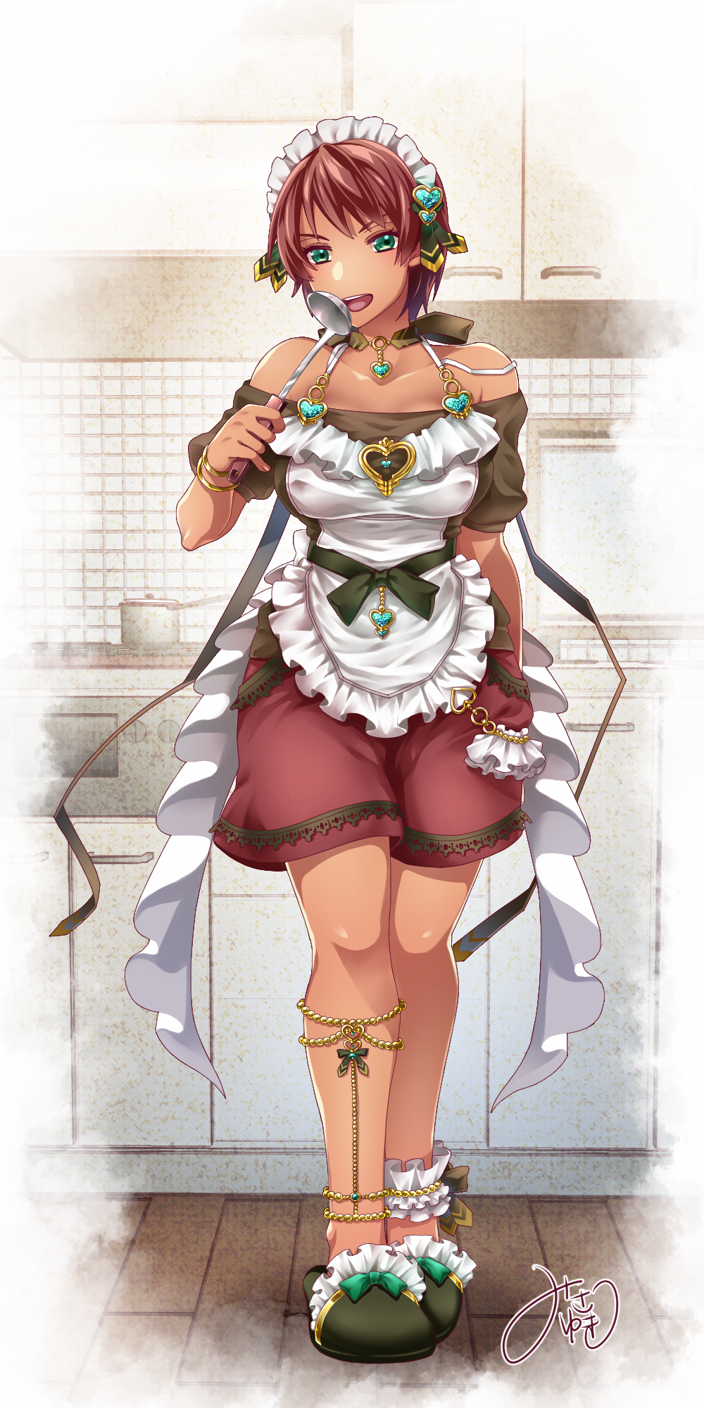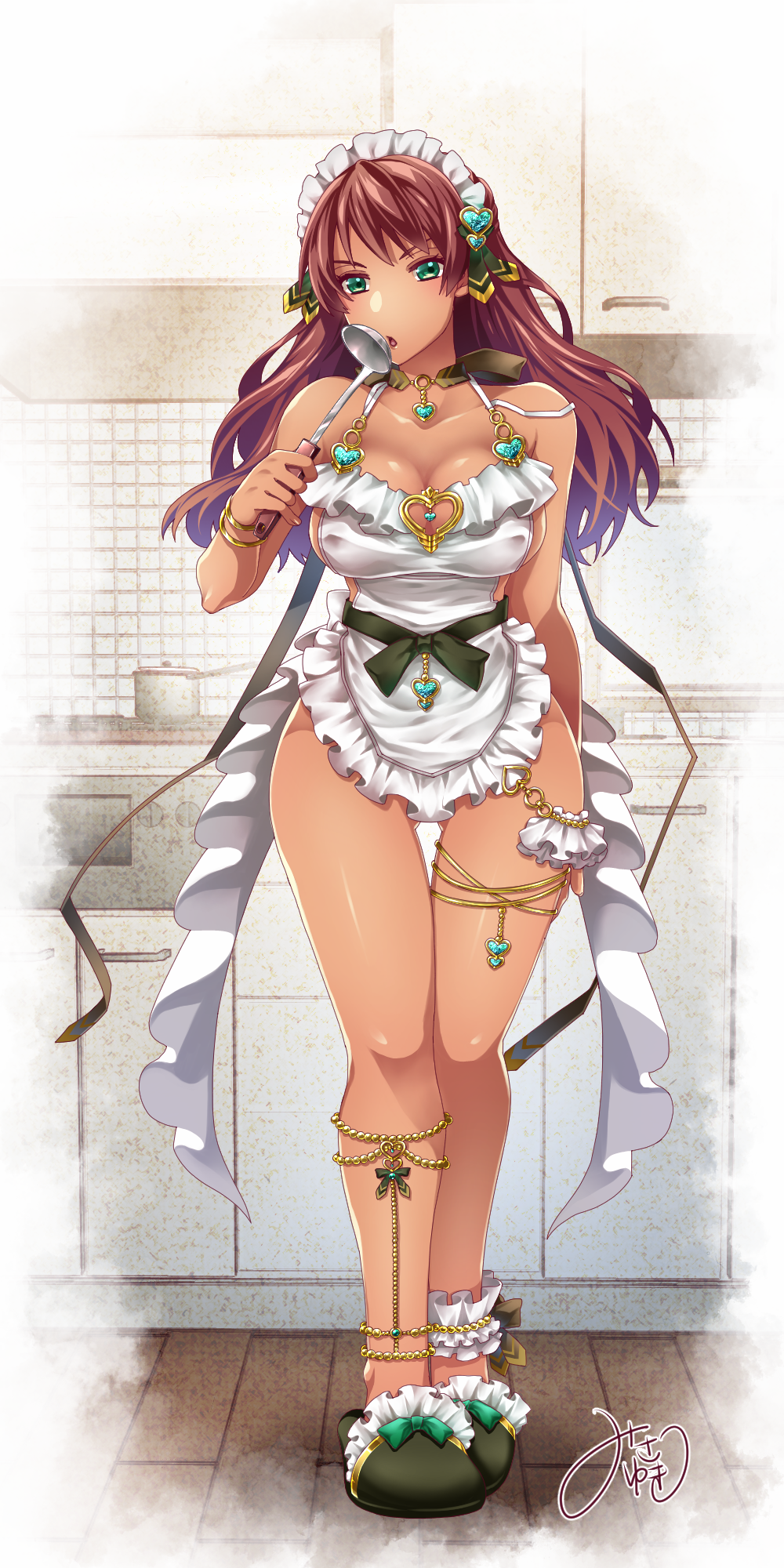 まおはじ女子裸エプロンシリーズ第七段、ナジャ。 キッチンでおたまを構えた新妻感とムチムチの体型がたまらないですね。