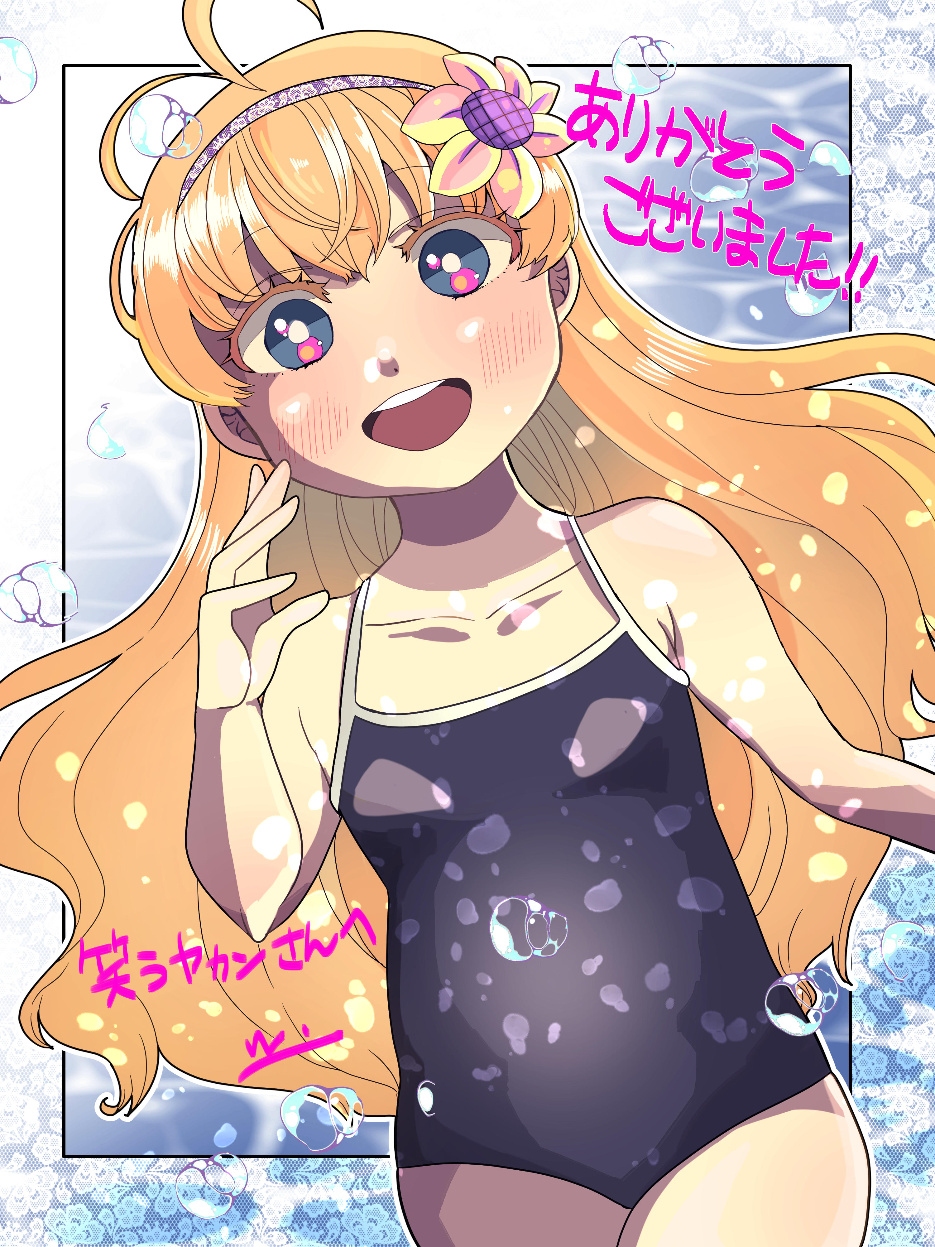 2000枚近くファンアートを貰っておきながら、スク水を描いてもらったことがほぼないということに気づき取り急ぎSkebでお願いしたスク水マリーちゃん。流石の速筆で一日で仕上げてくださいました。ここにまおはじスク水部を発足する──!
