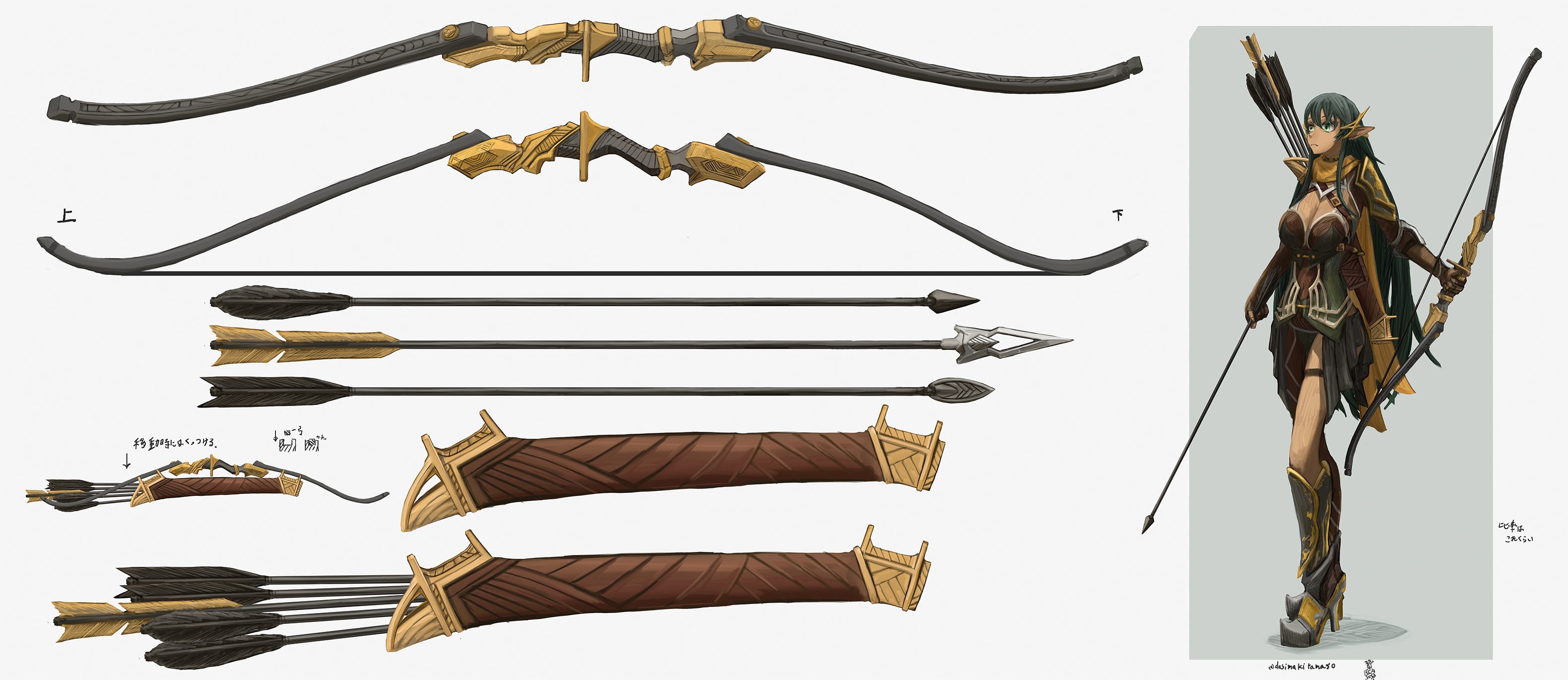 毎回素敵な武器をこしらえてくださる絵露河童さんに、今度はエレンが使う弓を作っていただいたもの。設定的にドワーフが作った物なので、ちょっと近代みのある金属製のもの、という指定で描いて頂いたんですがエレンにばっちり似合う素敵な弓を頂けました。矢筒が弓にくっつくギミックカッコいい!