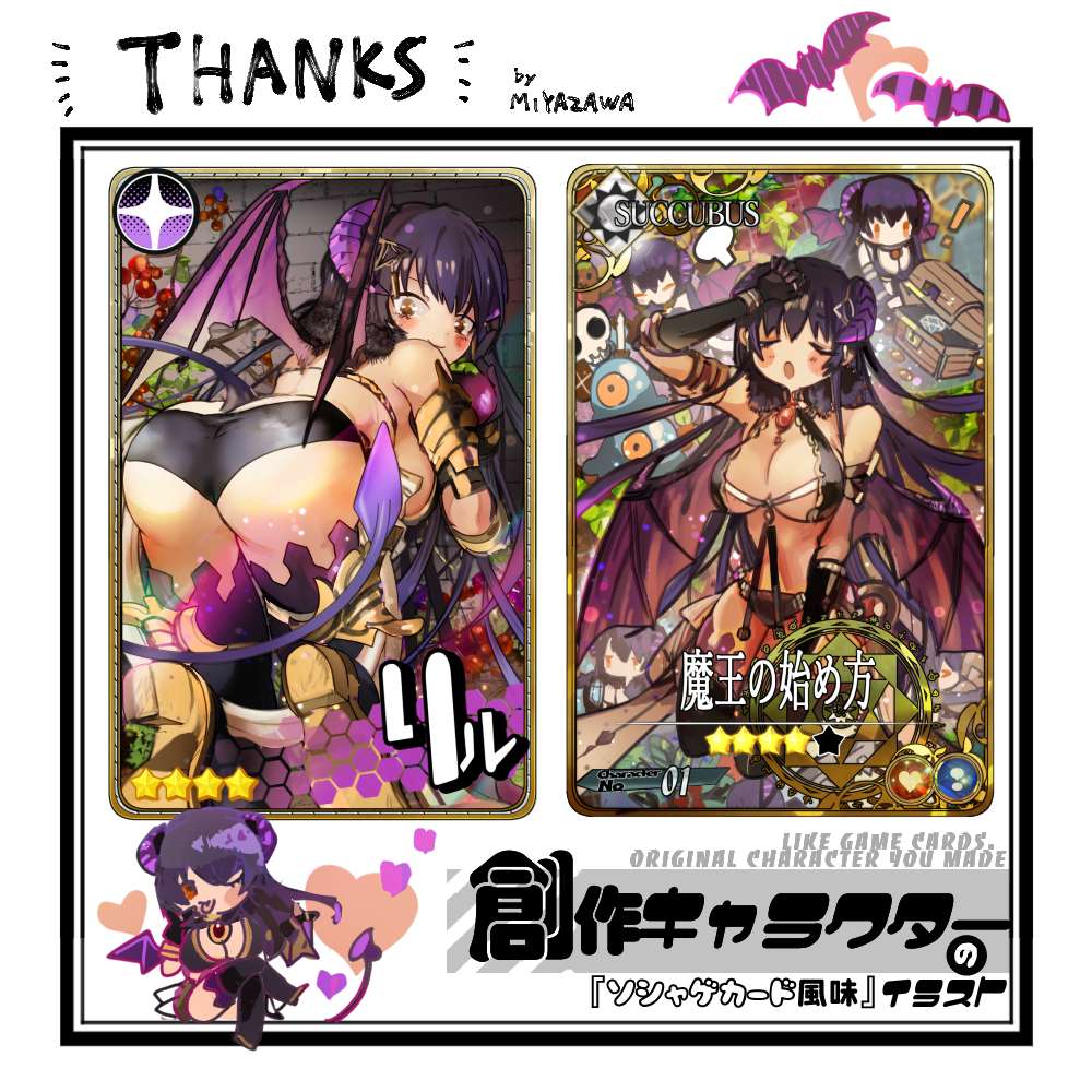 ソシャゲカード風のイラスト。背景付き二枚にSDキャラ、コウモリアイコンまで付いてきて盛りだくさん! 一生懸命働くリルが凄く可愛いです。
