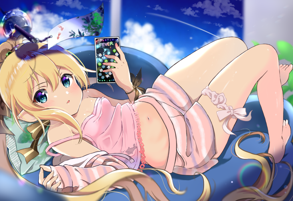 欲しいFAリストNo.52「ラフな格好でソファに寝転びながらスマホでツムツムやってる竜歴6050年のニーナ」を描いて頂いたもの。だらけっぷりが素晴らしい。ぼやけて見づらいけど左下に別のスマホを構えているのが見えている……?