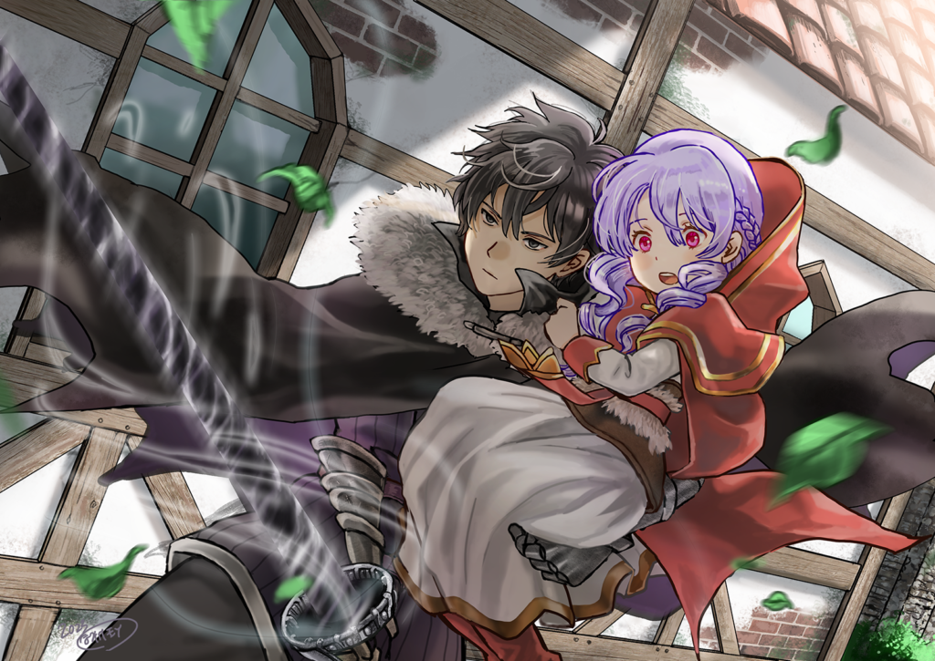 第3回FAコンに投稿頂いた作品。片腕にリィンを抱え、片腕で愛剣を構えるソルラク。渦を巻いて回転するカレドヴールフの迫力と二人の体格差が大変おいしいです!