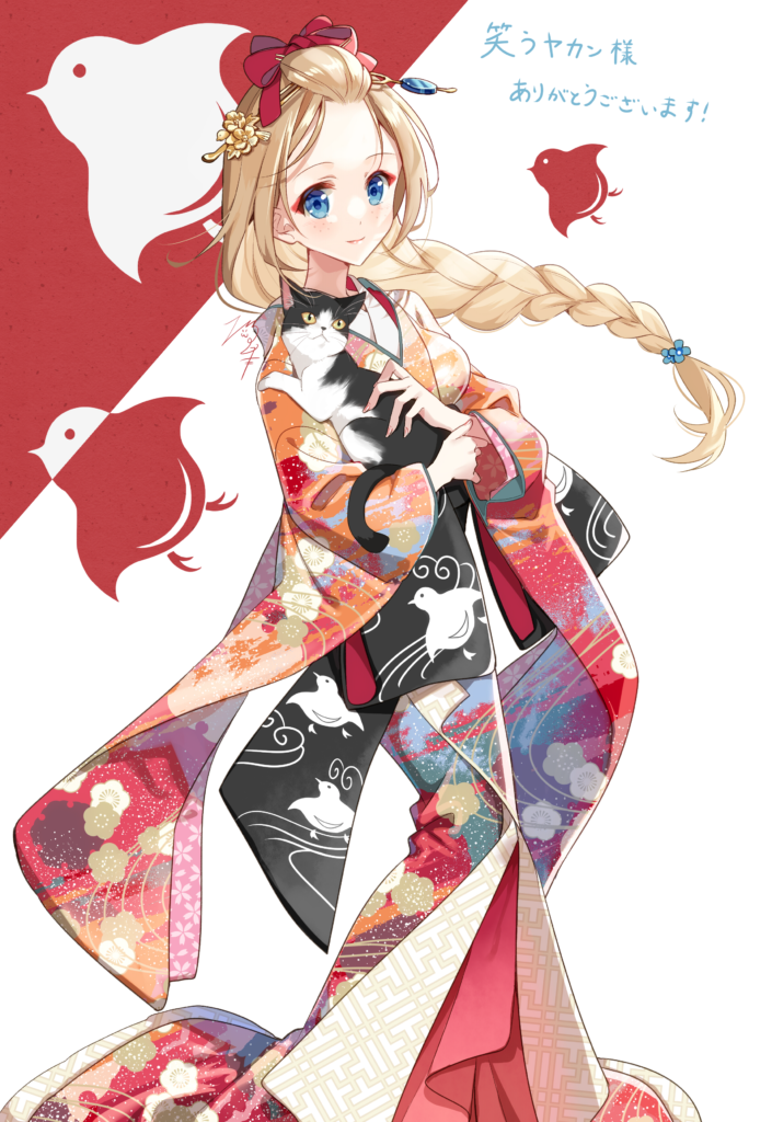 猫月先生の花魁シリーズ第10段。ついに2桁の大台に突入。すらっとした素朴なシルエットと太い三つ編みが可愛い! 胸に抱いたネコチャンと帯や背景の鳥も素晴らしい。