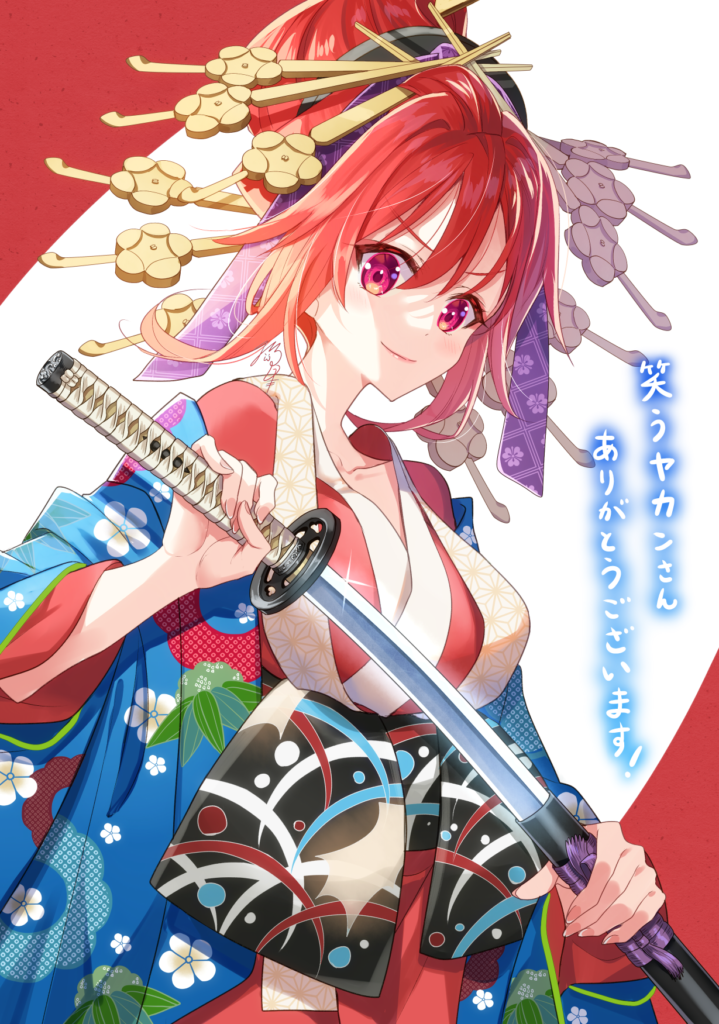 でっかいかんざしと構えた刀がめちゃくちゃ似合ってて素晴らしい。あと、斬撃のようであり、波紋のようでもある帯の柄がすっごく好きです。