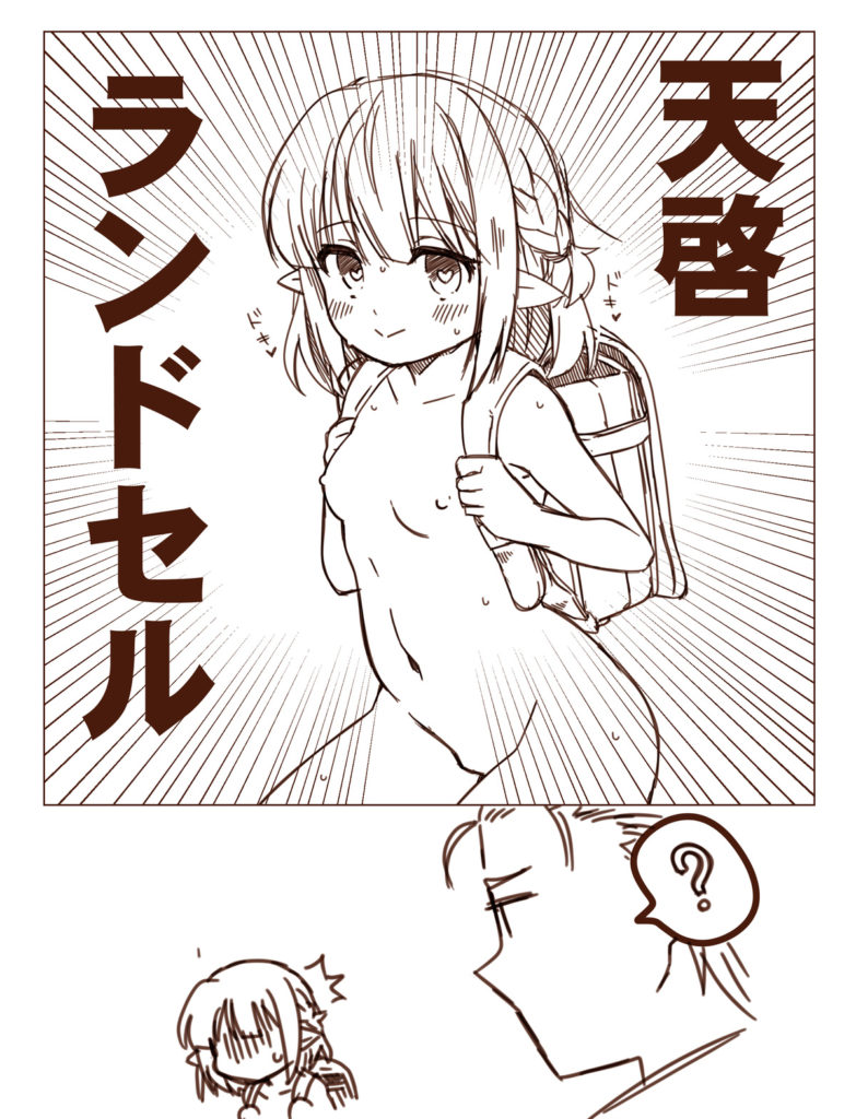 前の画像 次の画像 天啓ランドセル NTC(ニシ先生の突然のシャルちゃん)。何らかの天啓を得たらしいシャルによる裸ランドセル。どういう天啓なのかはわからないけどろくでもないことだけははっきり伝わってきます。