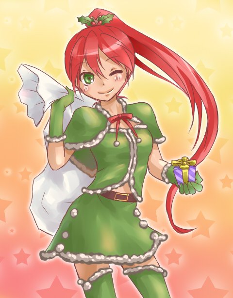 プレゼントを運ぶユニス。自前の赤毛と緑色のサンタコスでクリスマスカラー!