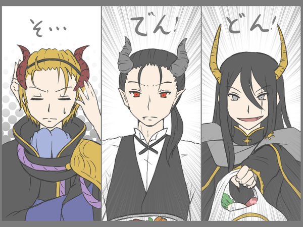真楠ヨウ先生の「真夜中カフェ(元)魔王」の魔王(中央)と、雪乃下ナチ先生の「となりの魔王」の魔王。そしてうちの魔王の始め方の魔王が集まって鍋をする絵。