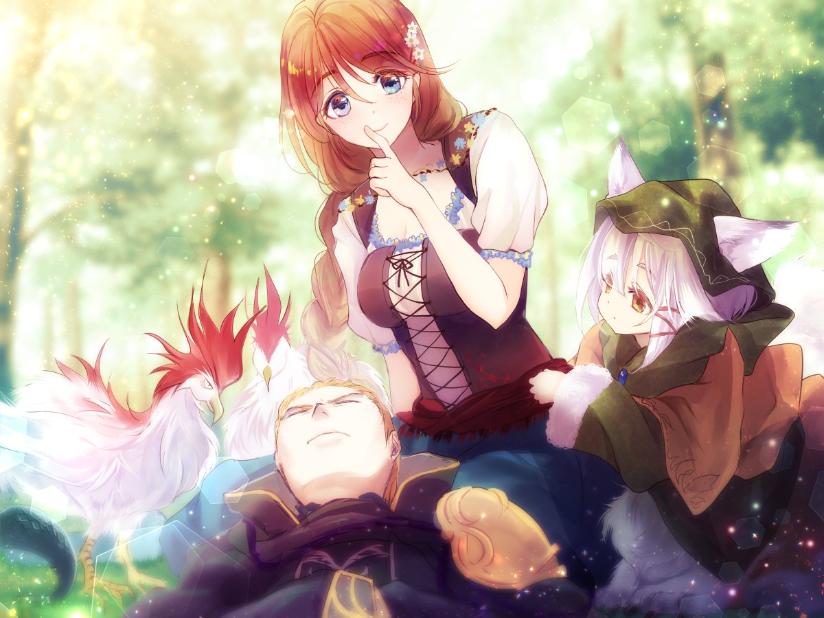 ミオの膝枕で眠るオウルと、それを見つめるルカ。魔王の始め方のイラコンで描いて頂いたものですが、さらっと登場する別作品のキャラに笑いました
