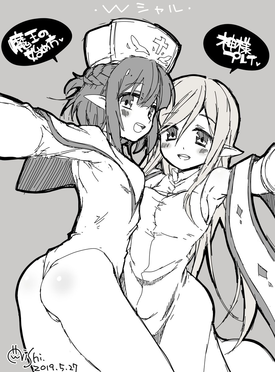 「魔王の始め方」のシャルと、ニシ先生の作品「ハーレムダンジョンで神様プレイ!」のシャルちゃん、服交換。