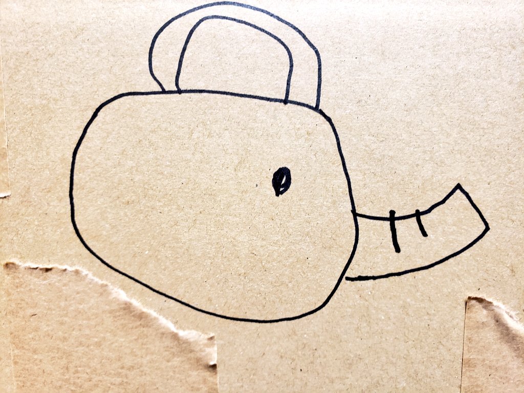 お中元で送られてきたダンボールに描かれてたヤカン。正確にはうりぼう先生の妹さんが描いてくれたもの。