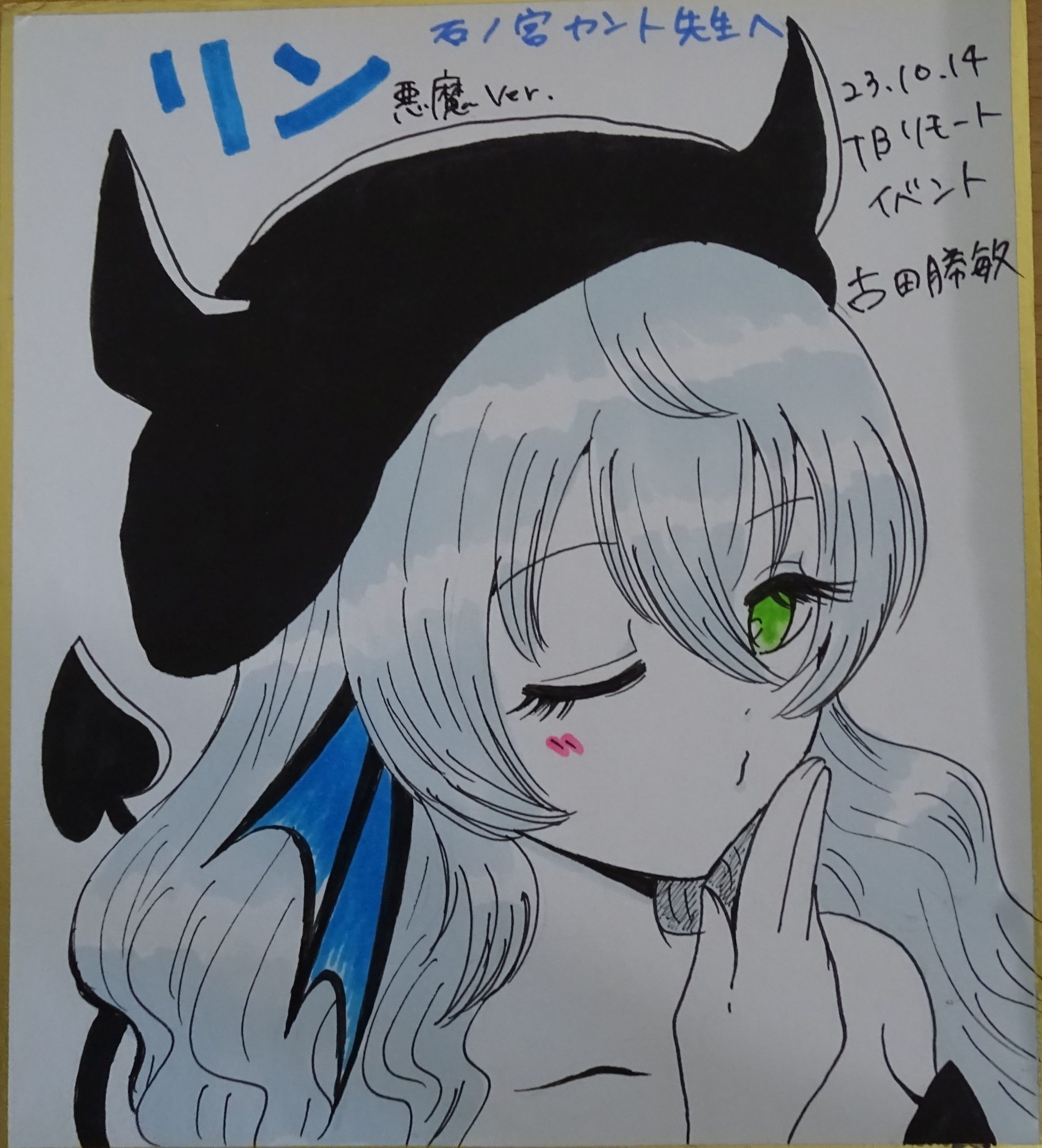 前の画像 次の画像 リン悪魔ver サブカルショップ「テクノブレイク中野店」さんのリモートイベントで描いて頂いた色紙。を依頼してくださったファンの方から送られたもの。 ノリノリで投げキッスをするリン。小悪魔だ……えっちすぎる。
