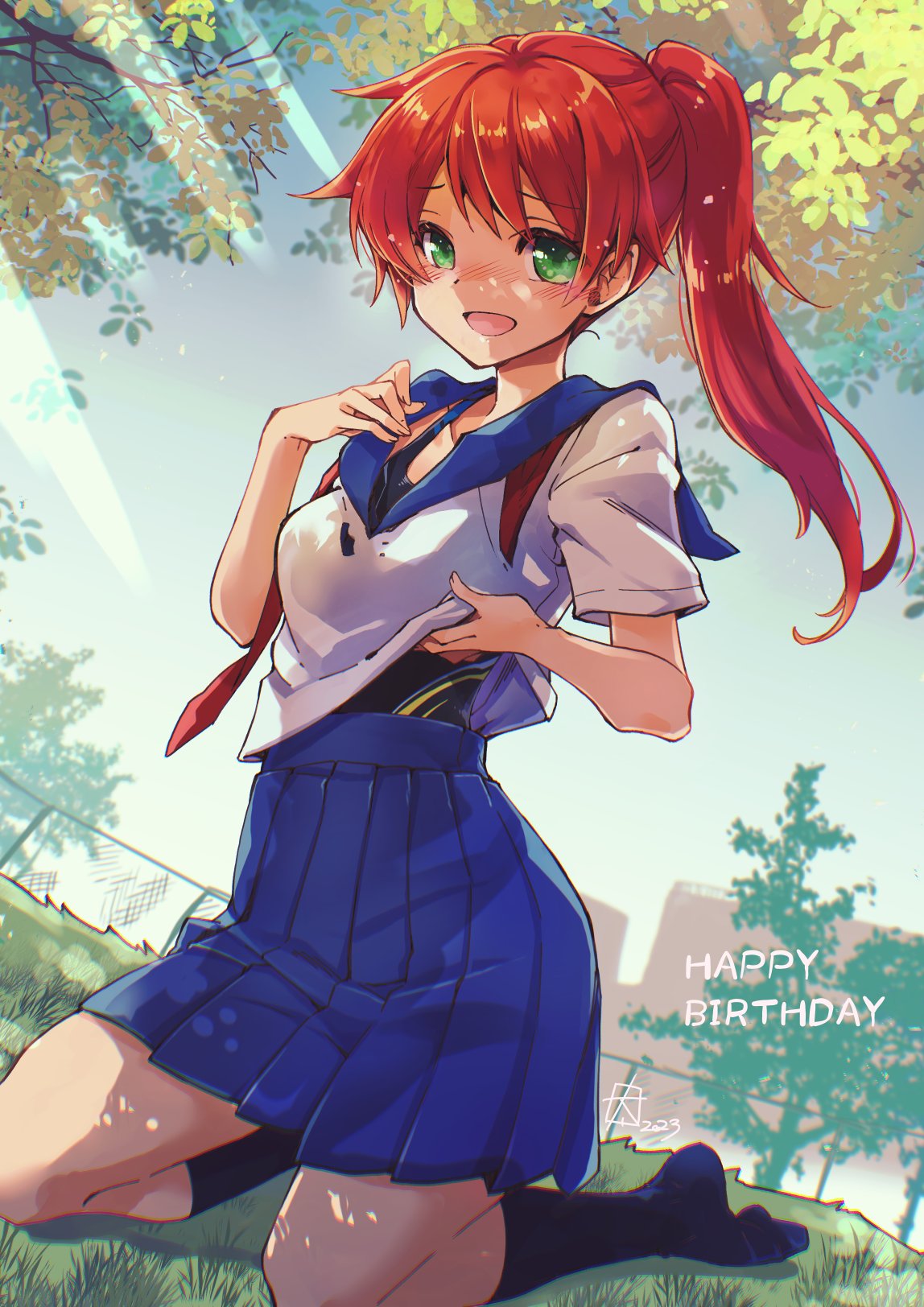 2023年の誕生日祝に描いて頂いたユニス。欲しいファンアートNo.73「木陰でセーラー服の上着をおもむろにはだけ、中に着込んだ競泳水着を見せてはにかんでいるユニス」を描いて頂いたもの。
