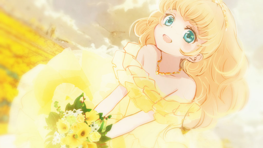 FA権を行使したら描いてもらえたウェディングドレスマリーちゃん三人目。まさかのお色直しカラードレスまで……! 黄色で統一された中、青い瞳が鮮やか。これはもう完全に結婚式。ローガンも草葉の陰で祝ってることでしょう。