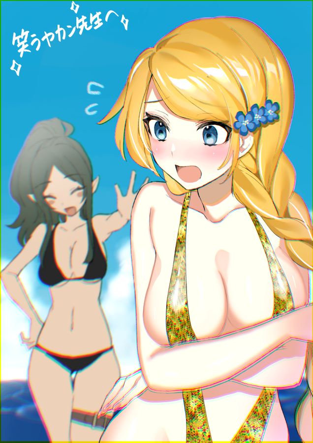 去年のあかさかさんのお誕生日にプレゼントを送りつけたら、そのお返しとして描いていただいたイラスト。普段地味な子が思い切った水着姿してるのいいよね……素晴らしいプロポーション。花の髪飾りもすごくいい。もともとのキャラデザについてた気がするレベル。おそらくこの水着を贈ったであろうエレンは割りと無難なのを着てるのも面白い。