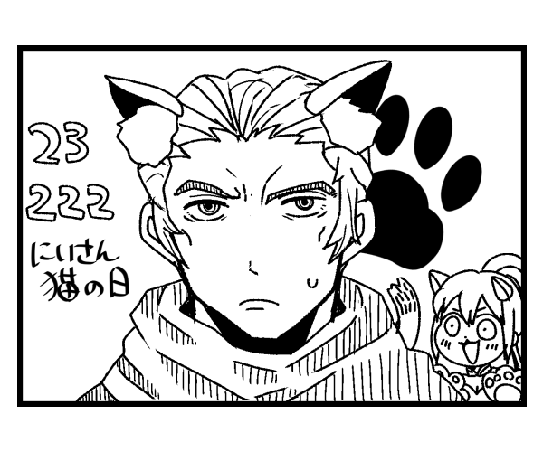 前の画像 次の画像 にいさん猫の日 2023年の2月22日、にいさんにゃんにゃんにゃんの日なので、ザイトリードが猫耳つけてる絵ください! と騒いでたら貰えた絵。 思いの外似合っているというか可愛い! そして後ろの猫ユニスも可愛い。