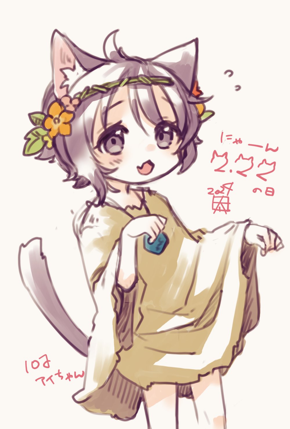 「#猫の日なのでリプ来たキャラにネコ耳を生やす」タグで募集してらしたのでアイをお願いしたもの。猫耳の幼アイ、可愛いしかない……成長後もそれはそれで似合いそうです。手まで猫っぽく丸めてるのと八重歯が大変愛らしいですね